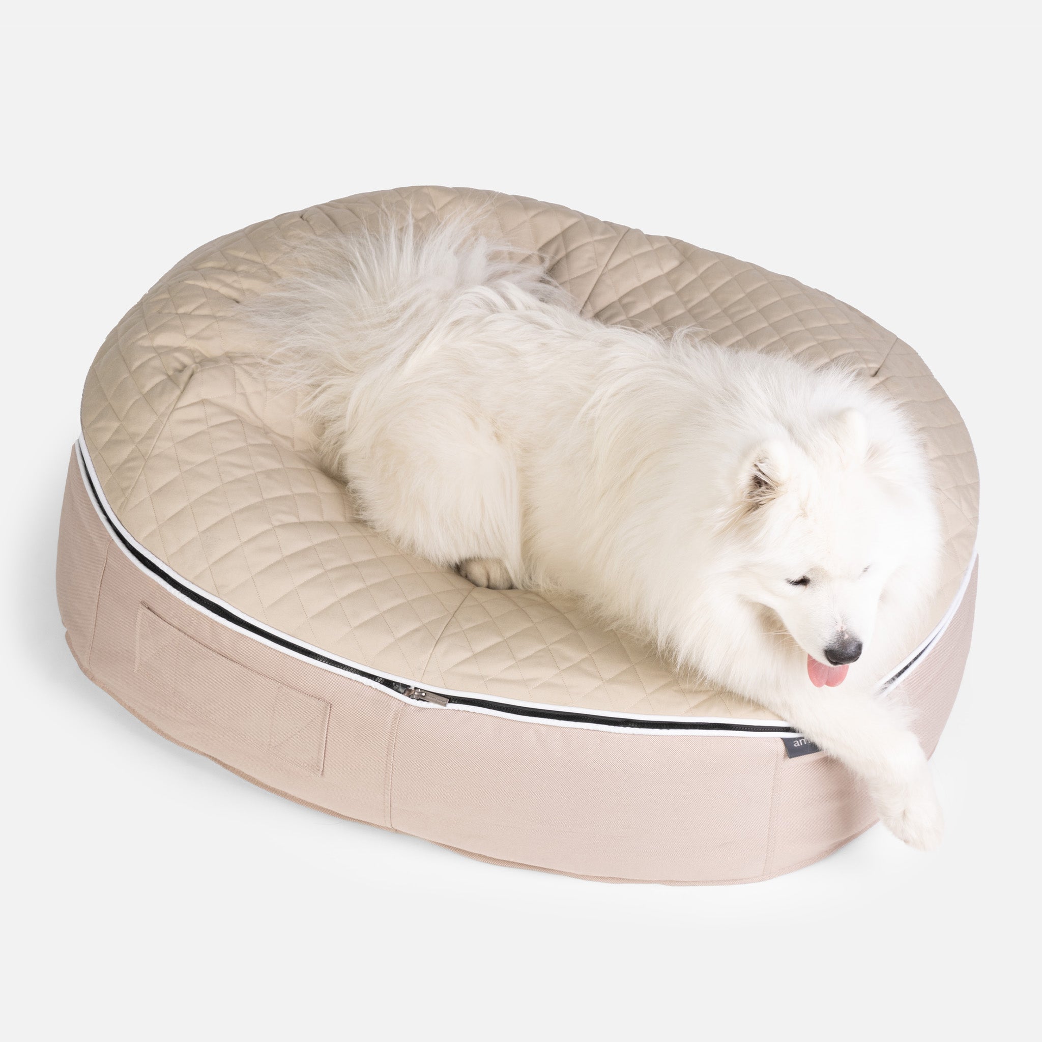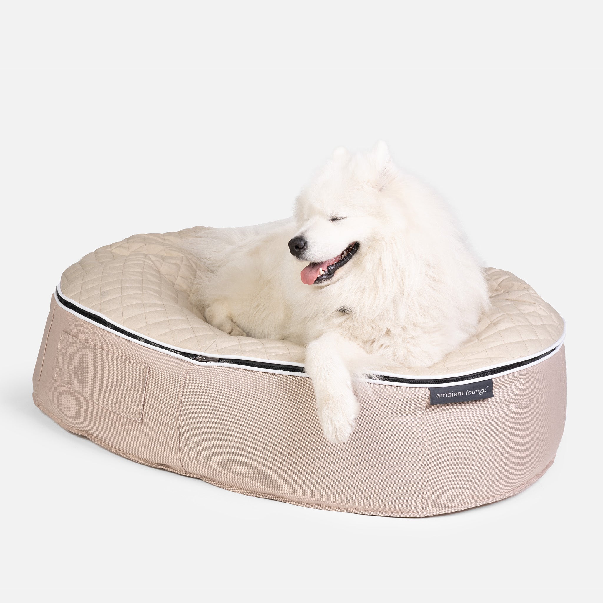 Absolut vielseitig – der abnehmbare, thermogesteppte Bezug kann auf dem Boden oder als Reisematte im Freien verwendet werden. Die Basis besteht aus dem bekannten, bissfesten und extrem strapazierfähigen Indoor-/Outdoor-Bett von Ambient Lounge. So erhalten Sie einen wasserdichten Outdoor-Sitzsack, der leicht zu reinigen und bissfest ist. Dank unseres speziellen internen Elastizitätssystems kann sich Ihr Hund im Pet Lounger einkuscheln und sich auf der weichen Oberfläche und den Außenwänden sicher fühlen. Wie auch vom australischen Blindenführhundeverband verwendet, ist er ideal für alle großen Hunderassen wie Golden Retriever, Deutscher Schäferhund, Border Collie, Dobermann, Labrador, Bernhardiner, Greyhound, Irischer Husky usw.